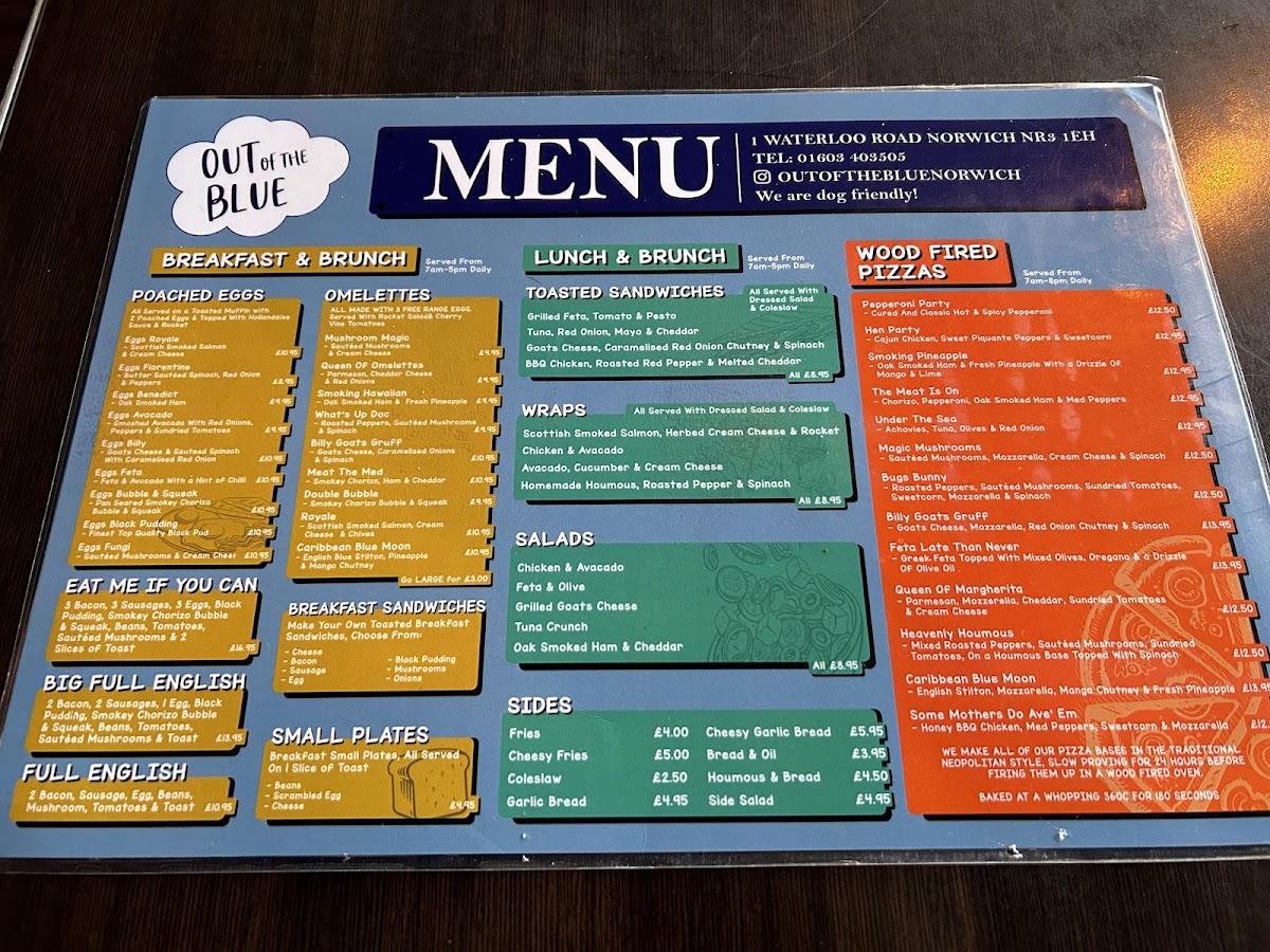 Introducing the menu at Out of the Blue Cafe, located at 1 Waterloo Rd, Norwich, is a delightful experience. Known for its eclectic offerings and friendly service, this café caters to all tastes, ensuring everyone finds something they love. The menu ranges from hearty breakfasts to delectable lunch options, showcasing fresh ingredients and vibrant flavors.